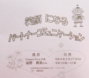 働く女性の気持ちを前向きに変える専門家塩野貴美です。山形市男女共同参画センターファーラ様主催で「笑顔になるパートナーコミュニケーション」を担…