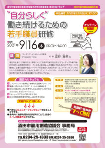 働く女性の気持ちを前向きに変える専門家塩野貴美です。山形県酒田市の企業様限定のお知らせです。若手職員を対象に自分らしく働き続け…